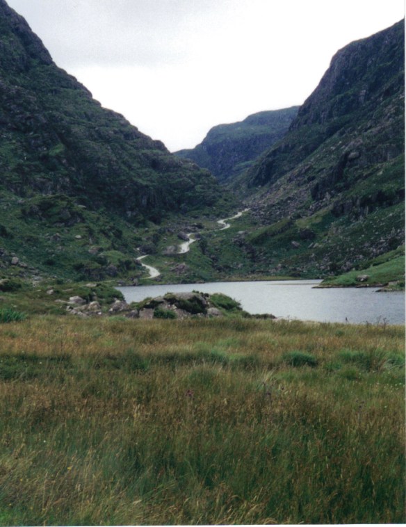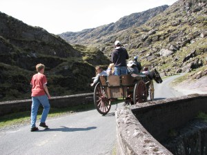 To save money, we decided to split up. My daughters and I would ride in the horse-drawn buggy through the Gap of Dunloe, and my husband and 15 year old son would run/walk and meet us at the boats. We joked about who would arrive first…the trusty horse and its passengers, or the hearty he-men who would conquer the mountainous terrain. Amazingly, the hearty he-men kept catching up with us at various points along the way, as seen in the below picture.